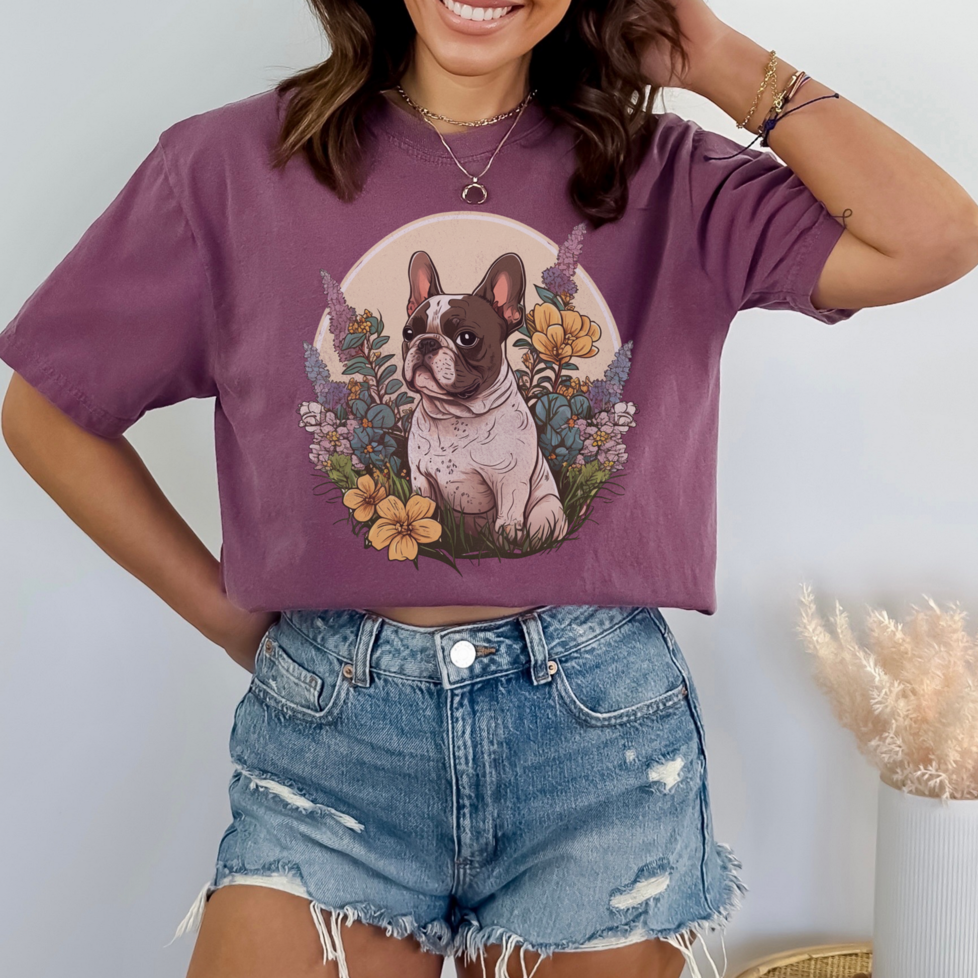 You'll get a lot of compliments on this peaceful Frenchie in the flowers!